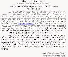 On 19th February 2015 (Thursday) Bihar Public Service Commission (BPSC) has issued the admit card for preliminary examination to be held on 15th March, 2015 between 12 noon - 2 PM on its website http://bpsc.bih.nic.in